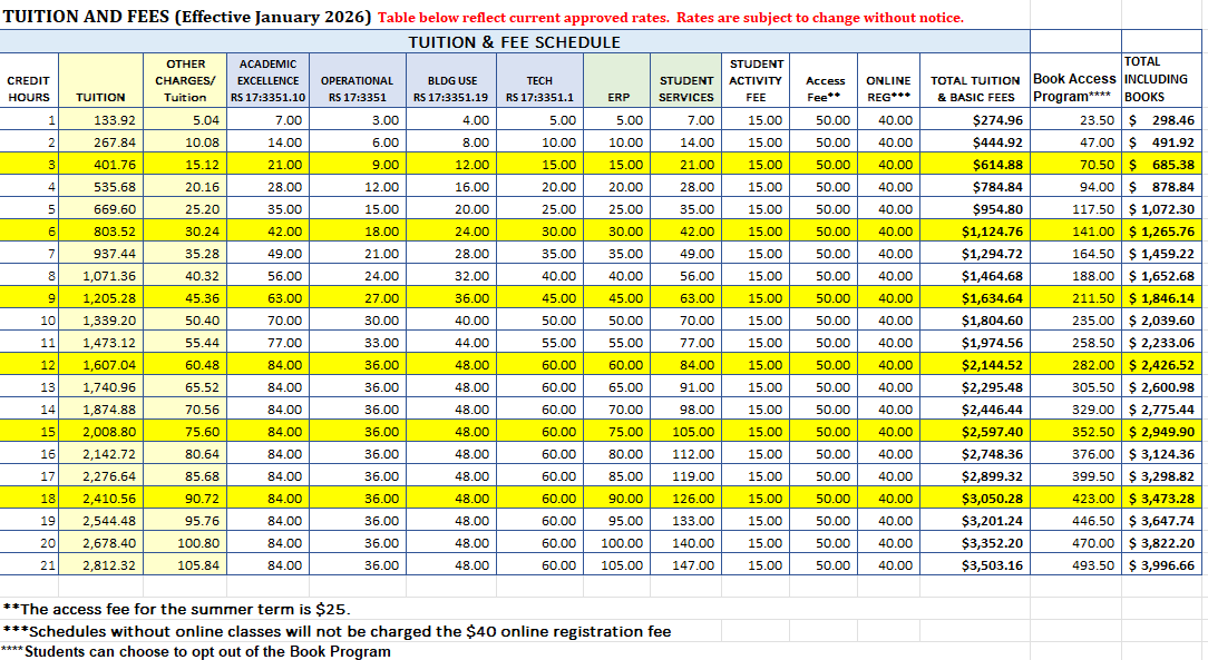 Any tuition, charges, or costs required by a program are subject to change at any time without notice. All courses, programs, and activities described in this catalog are subject to cancellation or termination by the College or the Louisiana Community & Technical College Board of Supervisors at any time. The academic regulations and degree requirements are subject to revision during the effective period of this catalog to reflect changes in board policies, occupational and licensure requirements, and other changes related to the quality of the program.